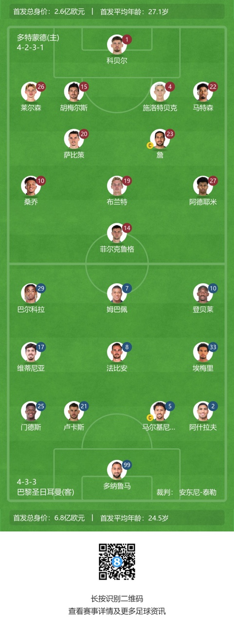 多特首發(fā):1-科貝爾、26-萊爾森、15-胡梅爾斯、4-施洛特貝克、22-馬特森、20-薩比策、23-埃姆雷-詹、10-桑喬、19-布蘭特、27-阿德耶米、14-菲爾克魯格