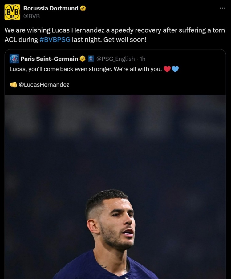 多特官推轉(zhuǎn)發(fā)了巴黎為盧卡斯加油的動態(tài),并寫道:“在昨晚的比賽中,盧卡斯十字韌帶斷裂,我們希望他能早日康復(fù)。希望你能快點好起來!”