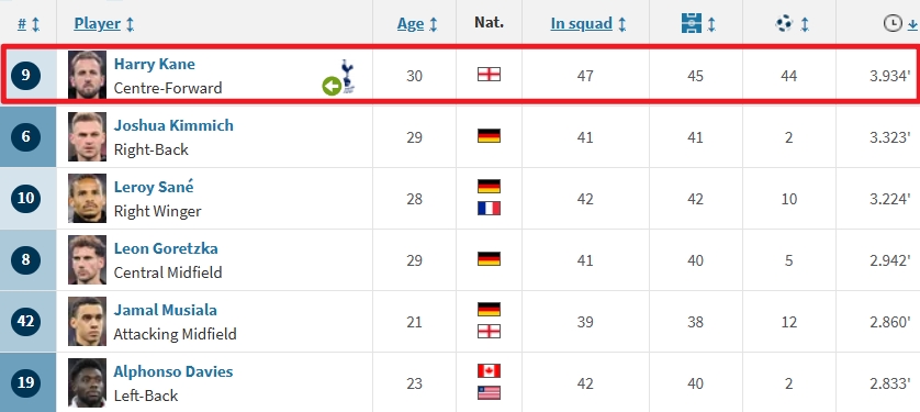 凱恩是拜仁本賽季的“出勤王”,他本賽季一共出戰(zhàn)3934分鐘,排名拜仁隊內(nèi)第一。