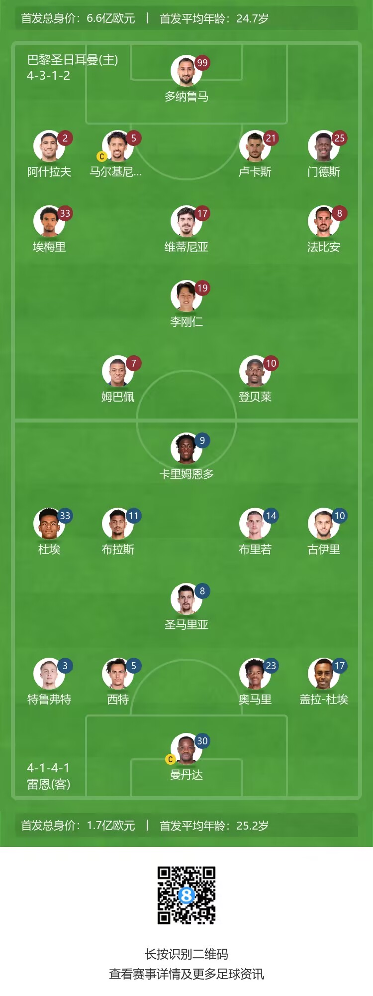 巴黎首發(fā):99-多納魯馬、2-阿什拉夫、5-馬爾基尼奧斯、21-盧卡斯-埃爾南德斯、25-努諾-門德斯、33-扎伊爾-埃梅里、8-法比安、17-維蒂尼亞、19-李剛?cè)省?0-登貝萊、7-姆巴佩