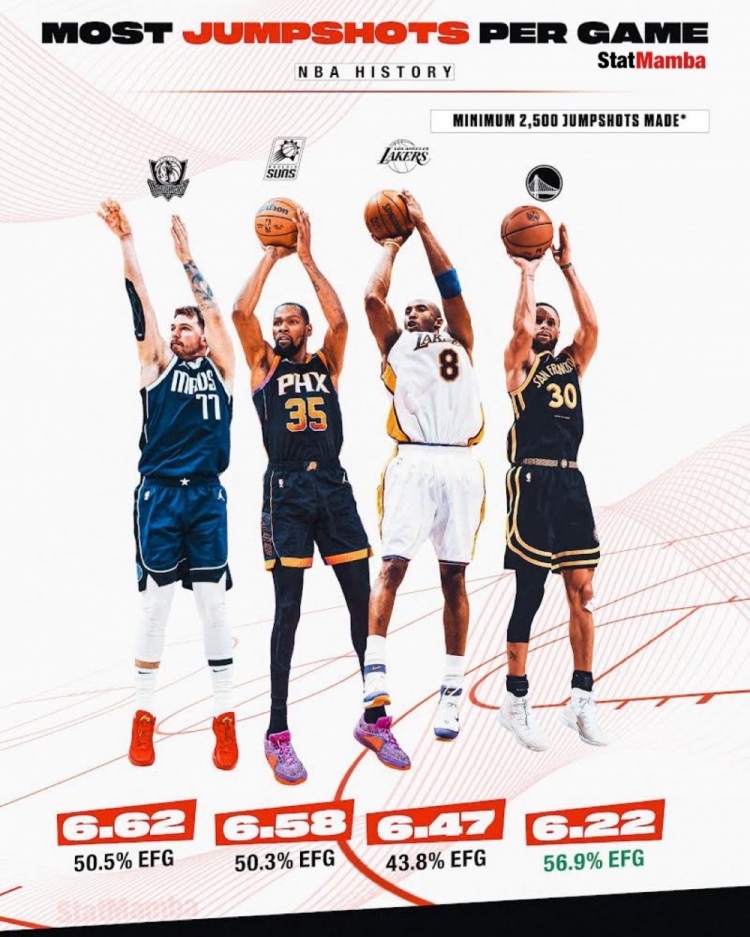 NBA歷史場均跳投得分王:東契奇6.62分居首 KD科比庫里分列2-4
