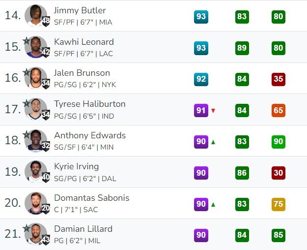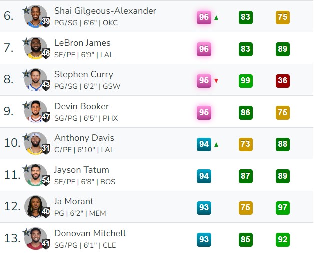 重點(diǎn)球員方面,亞歷山大96(+1)、庫(kù)里95(-1)、濃眉94(+1)、哈利伯頓91(-1)、愛(ài)德華茲90(+1)、小薩博尼斯90(+2)、??怂?9(+2)、阿德巴約88(+1)、馬克西88(+1)、錫安88(-1)、英格拉姆87(+1)、小賈倫-杰克遜87(+1)、霍姆格倫87(+1)、杰倫-威廉姆斯85(+2)、德里克-懷特85(+1)、康寧漢姆85(+1)、拉塞爾83(+1)、小波特83(+1)。