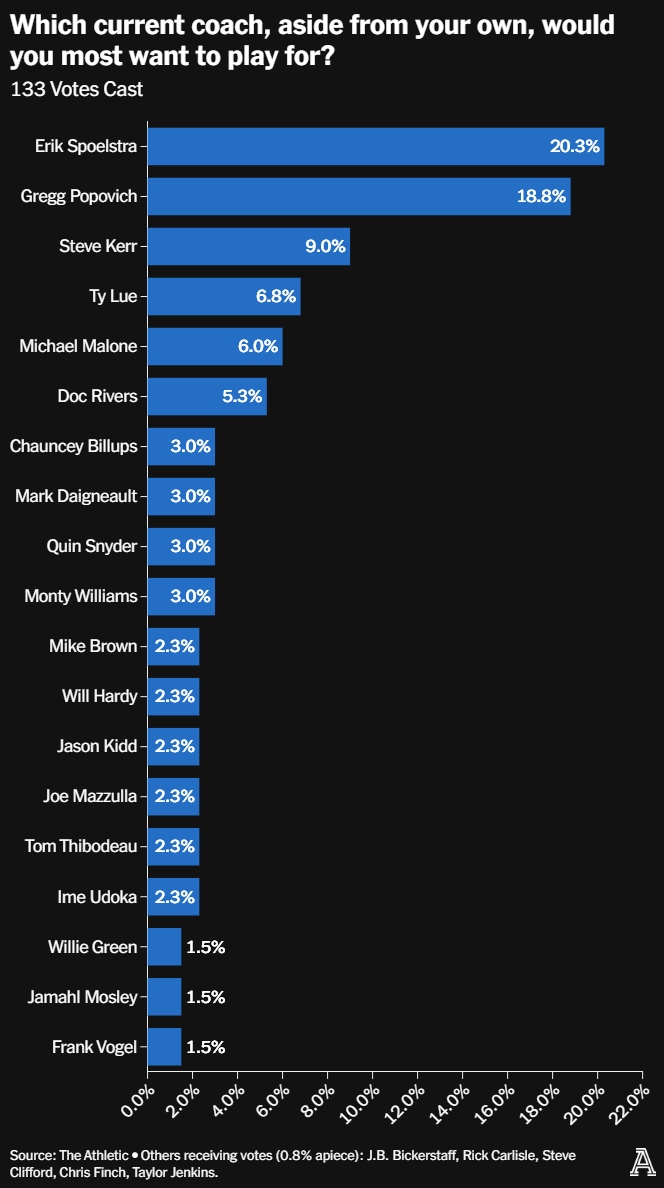 在關(guān)于最想效力的主帥(除了自己的主帥)投票中,有133人進(jìn)行了參與。最終斯波爾斯特拉以20.3%的得票率排在第一,波波維奇以18.8%排在第二,科爾以9.0%排在第三。