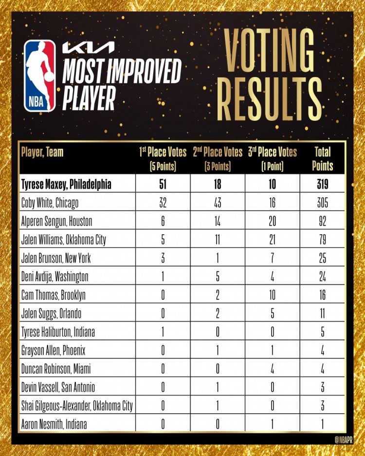 最快進(jìn)步球員投票詳情:馬克西319分力壓科比-懷特 申京第三!