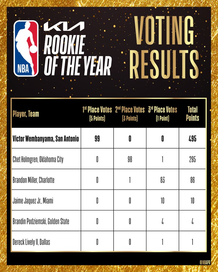 新秀獎投票:文班全票當選!切特第2 米勒第3 海梅第4 波姐第5