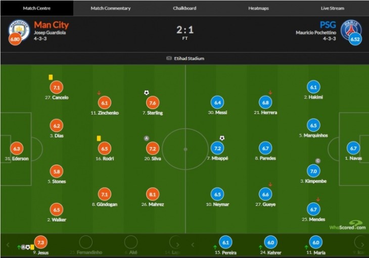 北京時(shí)間11月25日消息? 在剛剛結(jié)束的一場(chǎng)歐冠聯(lián)賽中,曼城2-1擊敗了巴黎。在賽后的whoscored評(píng)分中,馬赫雷斯拿到了全場(chǎng)最高的8.1分,熱蘇斯替補(bǔ)建功7.3分。巴黎方面,姆巴佩7.2分、梅西6.4分、內(nèi)馬爾6.5分。以下是詳細(xì)評(píng)分: