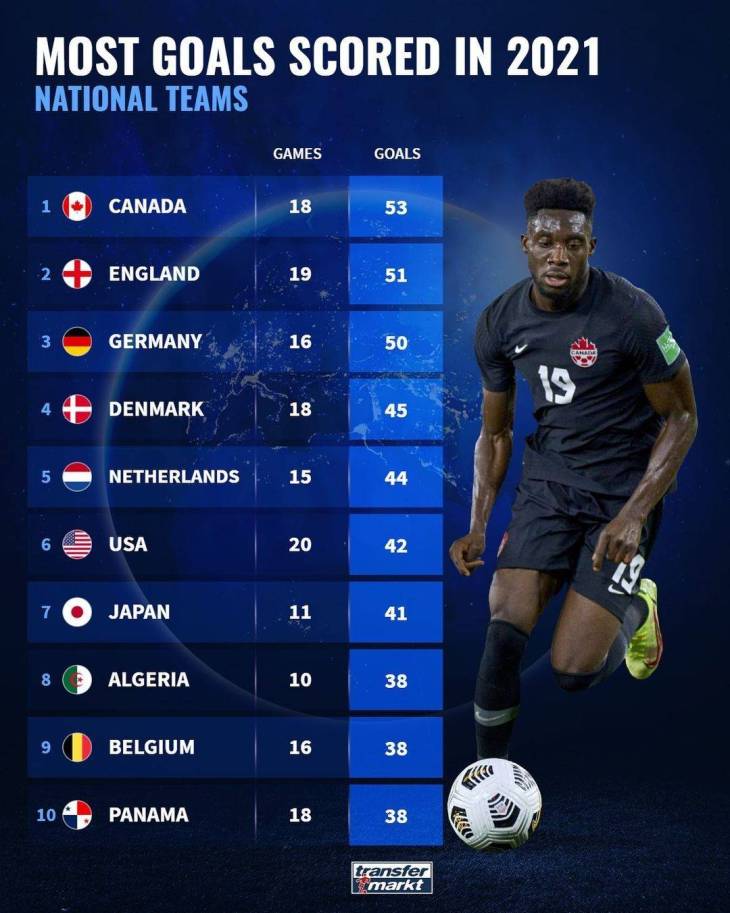 北京時間11月16日消息 德國轉(zhuǎn)會市場網(wǎng)站統(tǒng)計了今年以來各國國家隊進球榜,加拿大隊以53球居首,英格蘭和德國分列二、三位,此外,日本隊排名第七,是唯一上榜的亞洲球隊。