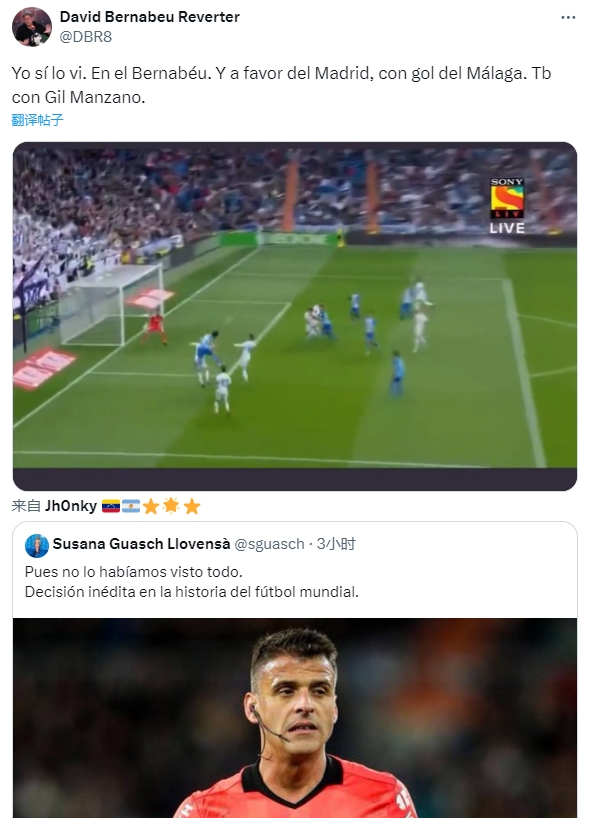有西班牙媒體人在社媒表示:“這是世界足球史上史無前例的吹罰?!卑退_系記者David Bernabeu Reverter轉(zhuǎn)發(fā)了這一推特,貼上吉爾-曼扎諾在2017年吹罰皇馬一場比賽中的判罰視頻,寫道:“我看到過。在伯納烏?;蜀R獲勝,馬拉加進(jìn)球被吹。還有吉爾-曼薩諾?!?/p>