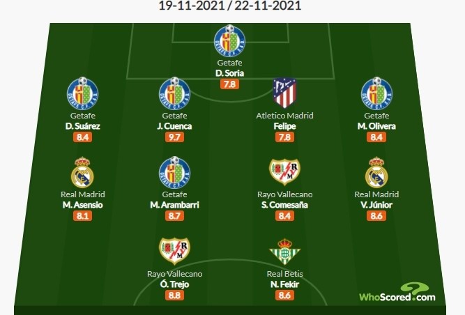 Whoscored西甲14輪最佳陣:阿森西奧、維尼修斯入選