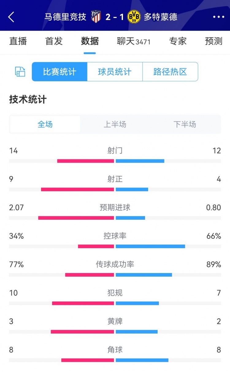 數(shù)據(jù)方面,馬競34%控球率,14腳射門,9次射正;多特66%控球率,12腳射門,4次射正。