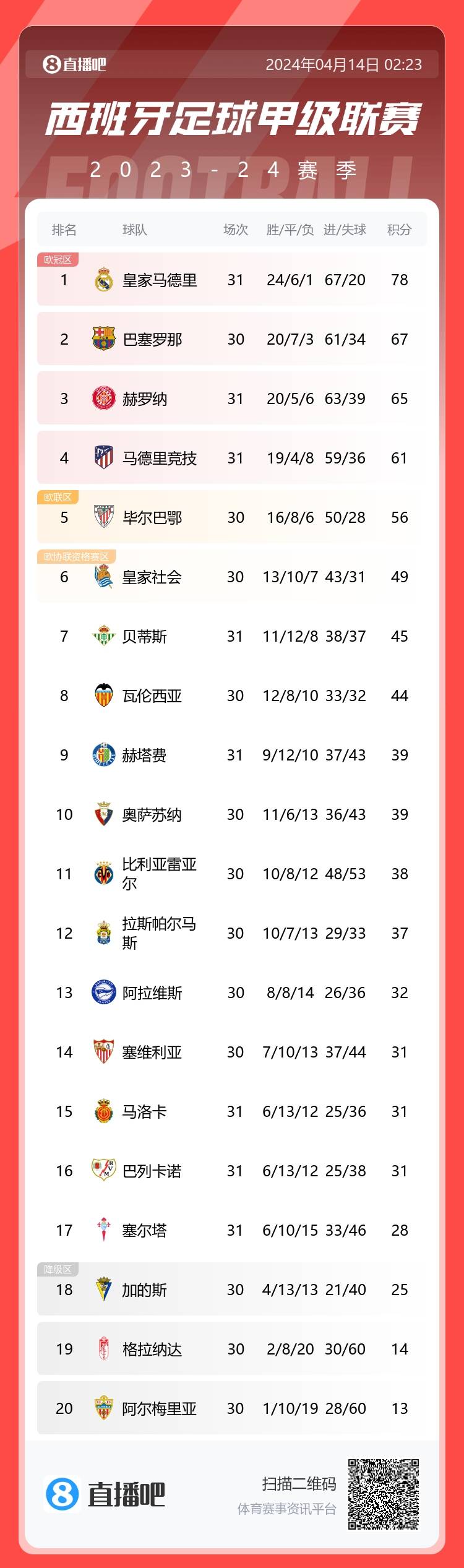 西甲積分榜:皇馬聯(lián)賽4連勝&25輪不敗,先賽11分領跑