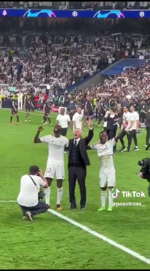 賽后,安切洛蒂和呂迪格、維尼修斯與球迷們一起高唱皇馬隊歌。