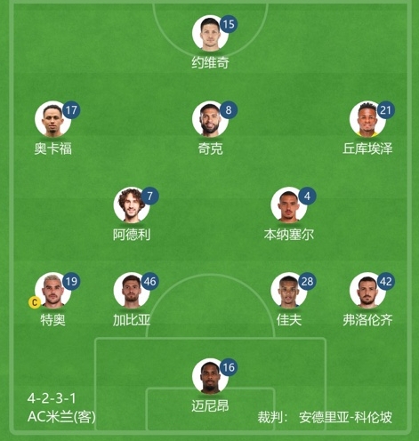 AC米蘭本場(chǎng)的首發(fā)陣容↓