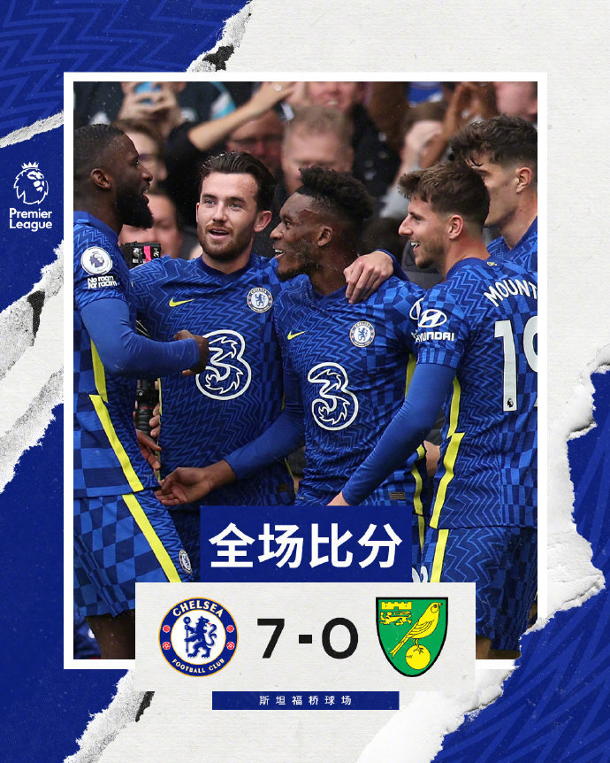 北京時間10月23日19:30,切爾西主場對陣諾維奇。比賽第7分鐘,芒特破門幫助切爾西取得閃電領先,第18分鐘,奧多伊單刀擴大比分。第42分鐘,里斯-詹姆斯將比分改寫為3-0。下半場,切爾西仍然沒有收手的意思,奇爾韋爾破門,奧多伊造烏龍,芒特又連入兩球上演帽子戲法,最終切爾西7-0橫掃對手,繼續(xù)領跑英超。
