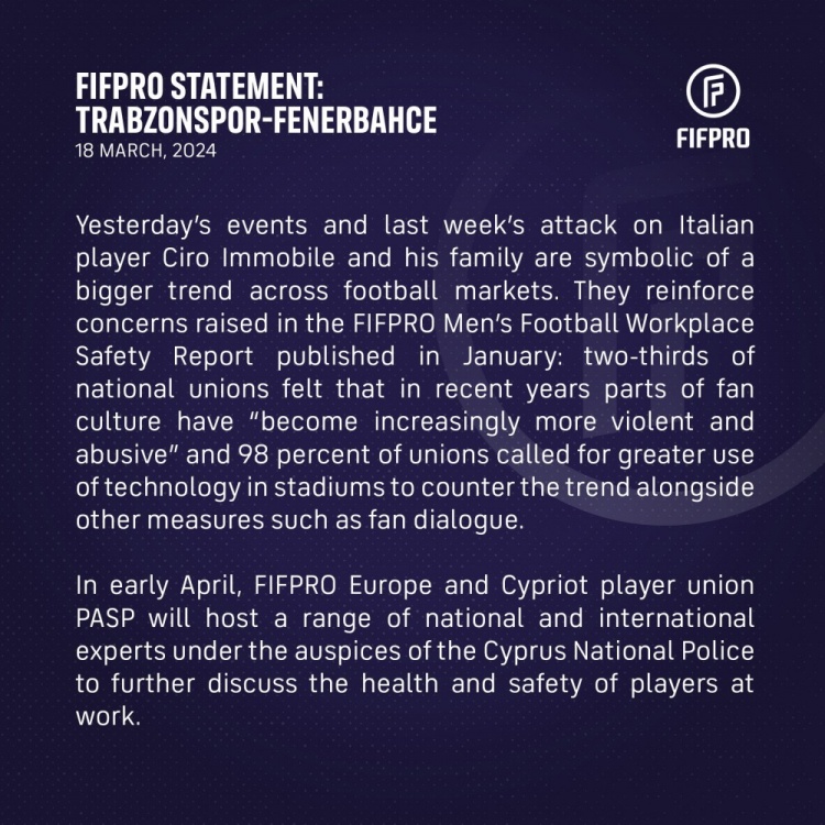 3月19日消息 FIFPRO 就特拉布宗體育vs費內(nèi)巴切比賽沖突事件發(fā)表聲明。