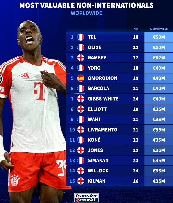 尚未在國家隊首秀身價榜前15:英法包攬14席,特爾、奧利斯居首