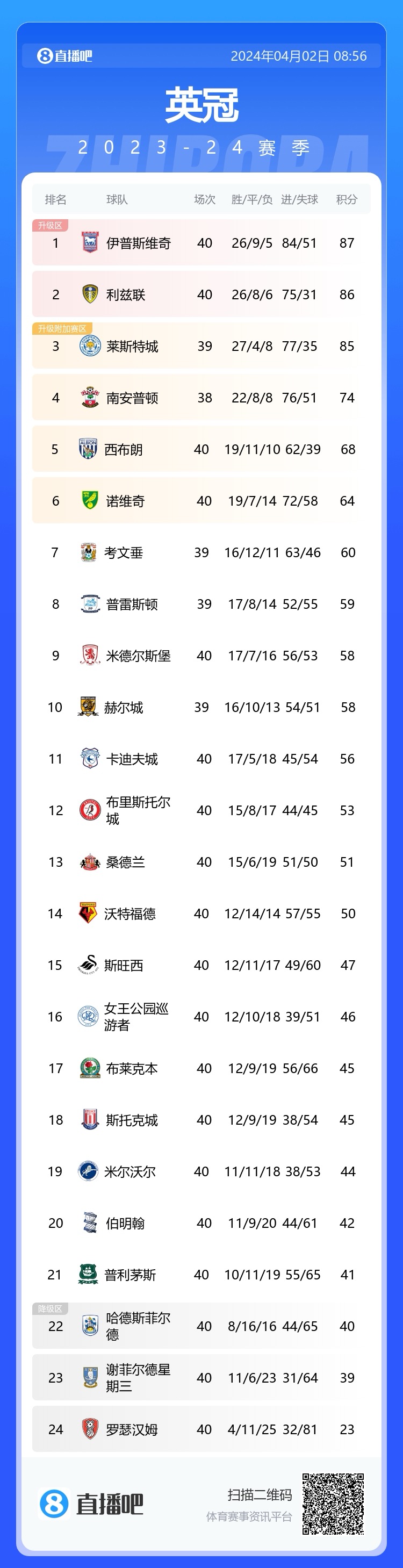 04月02日消息 英冠第40輪,升班馬伊普斯維奇3-2絕殺南安普頓,登頂英冠榜首。
