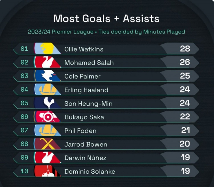 本賽季英超參與進球榜:沃特金斯28球居首,薩拉赫、帕爾默前三