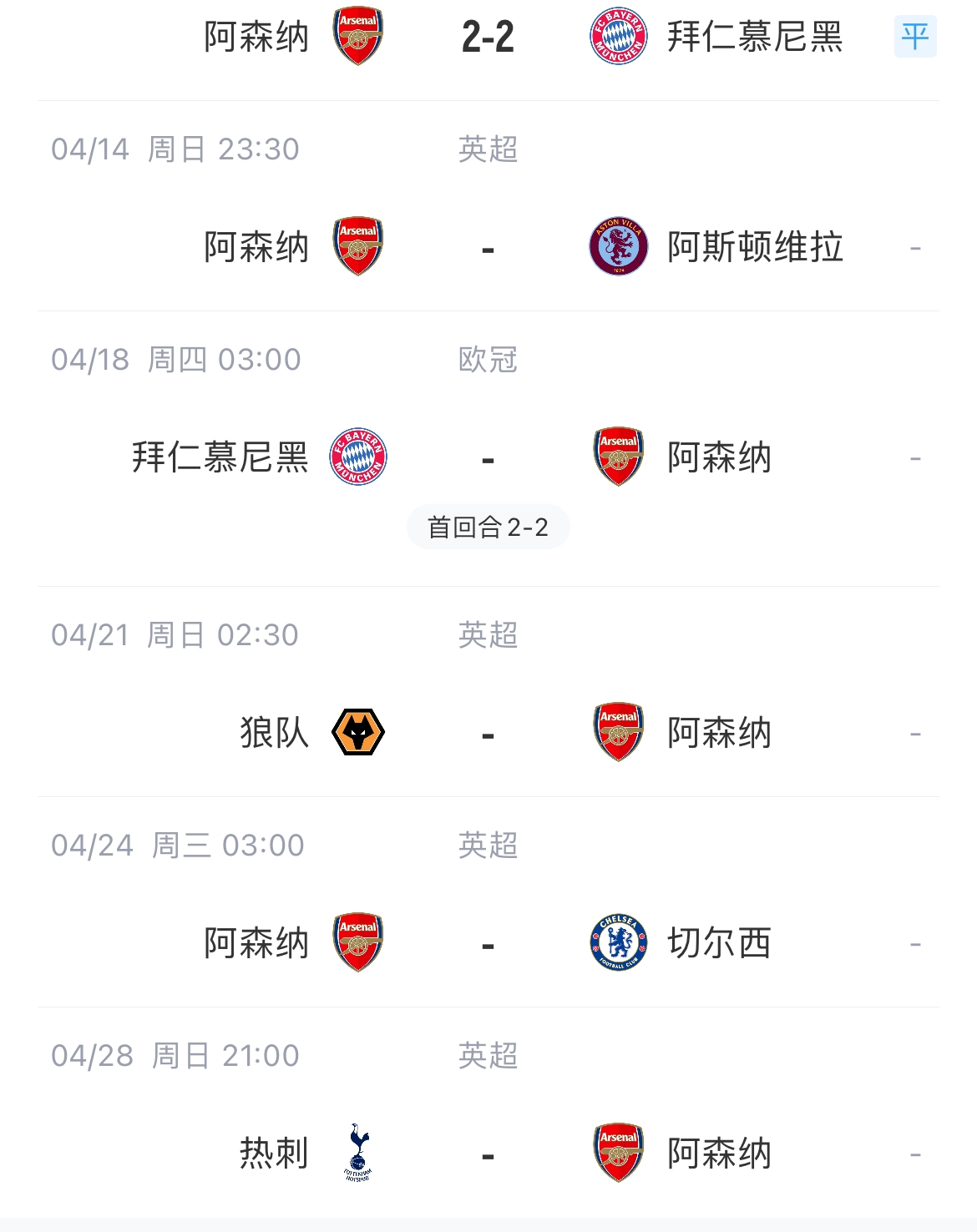 本周末,阿森納將回到英超主場對陣維拉,下周四客場挑戰(zhàn)拜仁。本月,阿森納聯(lián)賽還需對陣切爾西和熱刺。