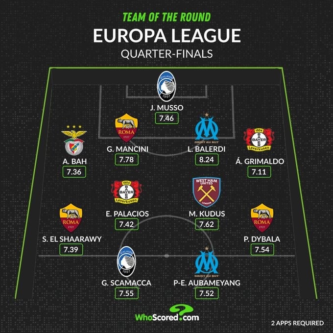 whoscored歐聯(lián)八強戰(zhàn)最佳陣:迪巴拉、奧巴梅揚、格里馬爾多在列