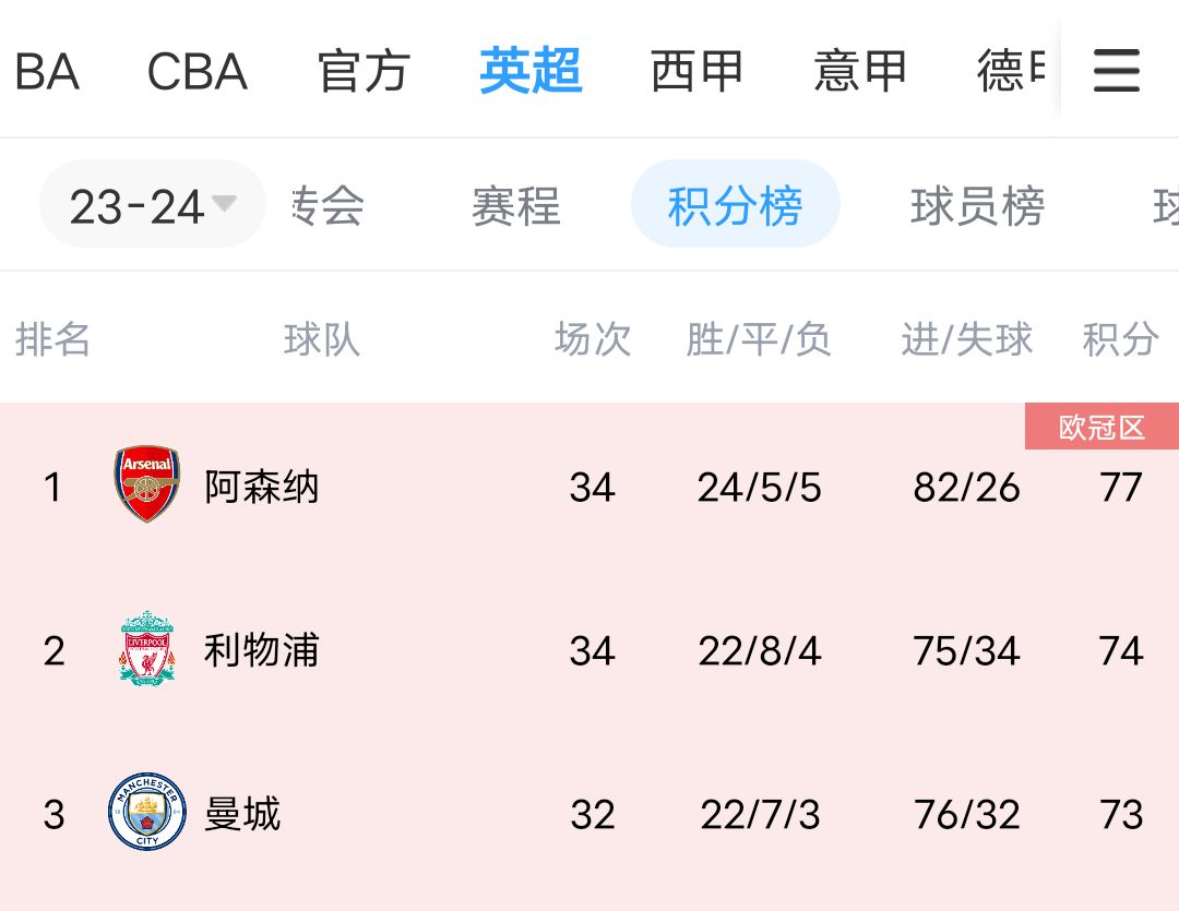 04月25日消息 英超爭冠進(jìn)入白熱化階段,利物浦不敵埃弗頓丟掉關(guān)鍵3分。目前,阿森納77分排名第一,利物浦排名第二。