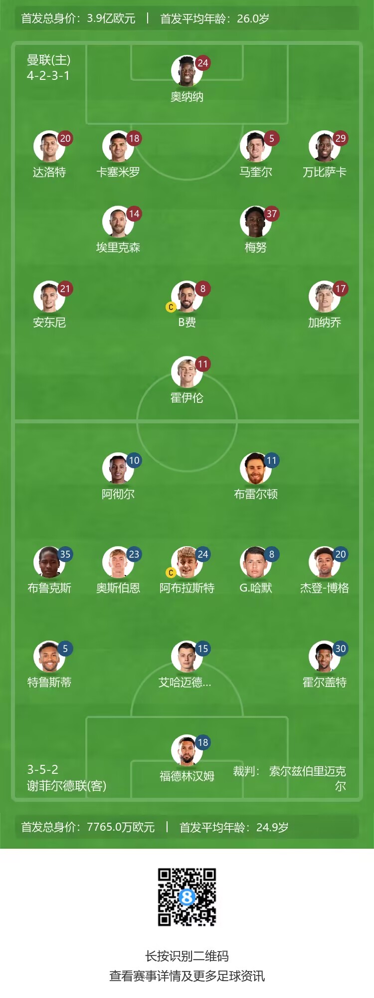 曼聯(lián)首發(fā):24-奧納納、5-馬奎爾、18-卡塞米羅、20-達(dá)洛特、29-萬(wàn)-比薩卡、37-梅努、14-埃里克森、8-B費(fèi)、21-安東尼、17-加納喬、11-霍伊倫