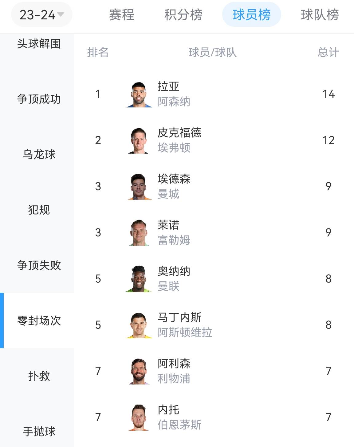 截至英超第35輪,拉亞已有14場零封,而身后的皮克福德36輪有12場零封,在太妃糖僅剩2輪聯(lián)賽的情況下,皮克福德無法完成對拉亞零封場次的超越。拉亞將成為2015-16賽季的切赫之后,首位獲得英超金手套的阿森納門將。