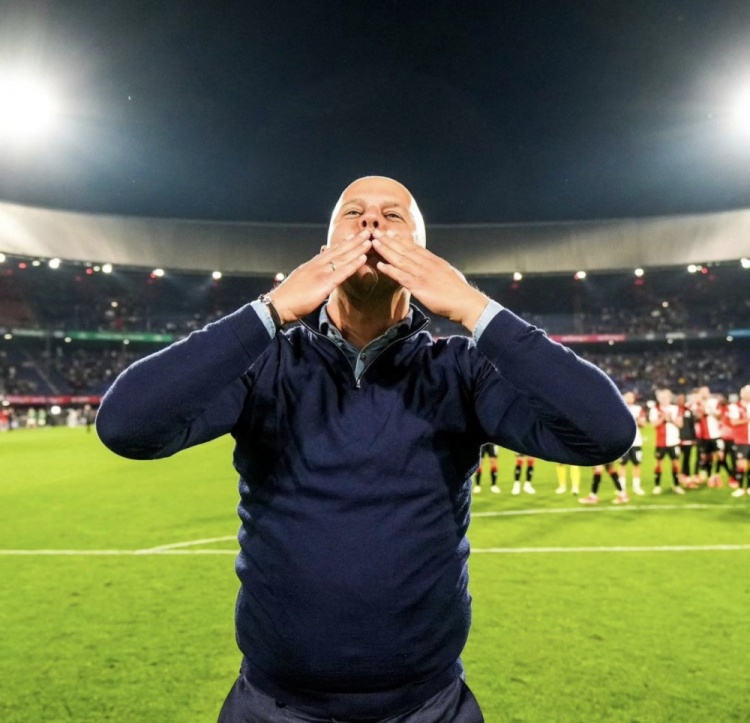 5月6日消息 費(fèi)耶諾德5-0戰(zhàn)勝茲沃勒,賽后,費(fèi)耶諾德主帥斯洛特向全場觀眾致意。