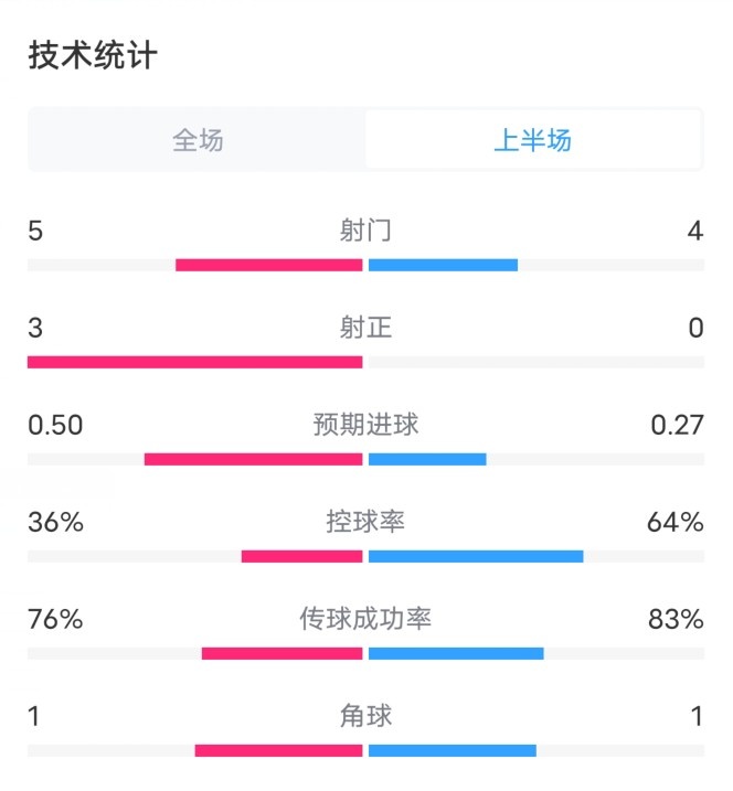 半場比賽數(shù)據(jù)如下(曼聯(lián)在后):