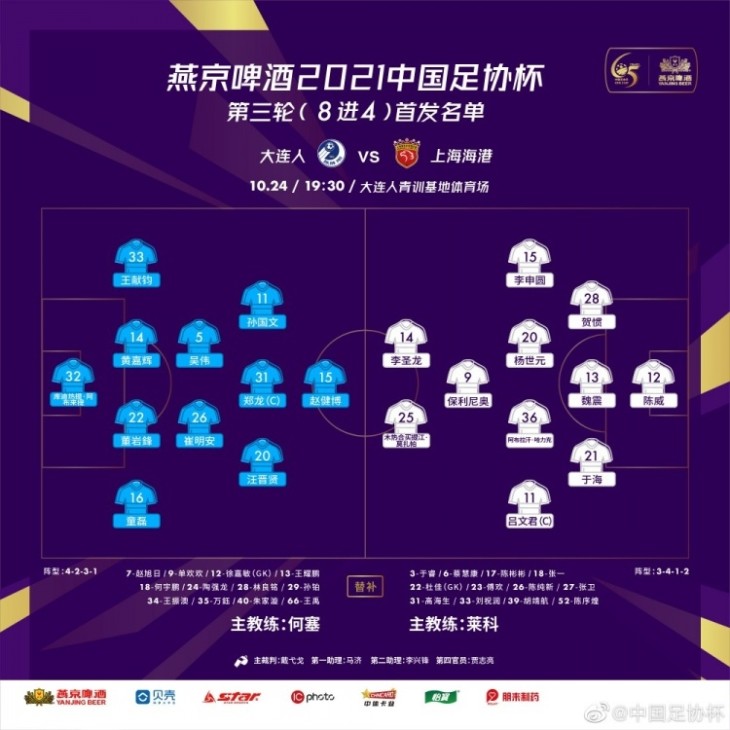 大連人替補(bǔ):12-徐嘉敏、13-王耀鵬、7-趙旭日、18-何宇鵬(U23)、28-林良銘、29-孫鉑、35-萬鈺(U23)、40-朱家漩(U23)、66-王禹(U23)、9-單歡歡(U23)、24-陶強(qiáng)龍(U23)、34-王振澳(U23)