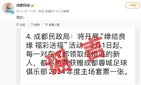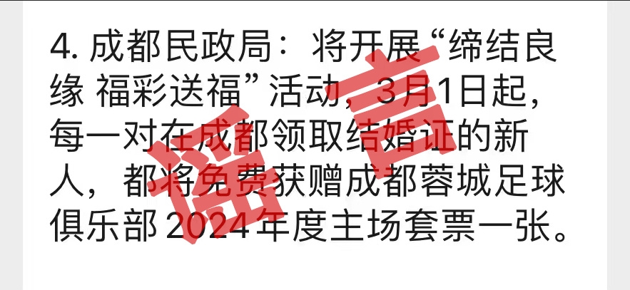 結(jié)婚送球票?假?成都民政局辟謠領(lǐng)結(jié)婚證贈(zèng)送蓉城主場(chǎng)套票