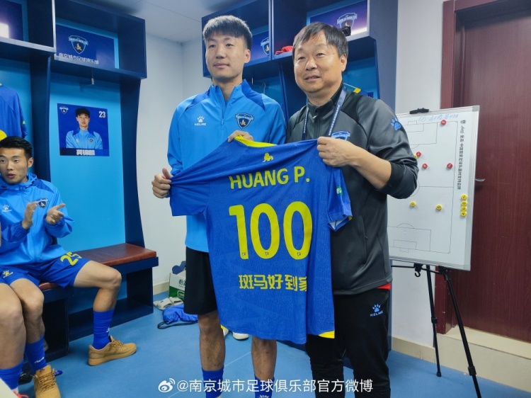 賽前,南京城市足球俱樂(lè)部在更衣室內(nèi)為黃鵬舉辦了一個(gè)小型的百場(chǎng)紀(jì)念儀式,在隊(duì)員的一片掌聲中,黃鵬從南京城市足球俱樂(lè)部總經(jīng)理吳海樂(lè)手中接過(guò)了象征著榮譽(yù)的“百場(chǎng)紀(jì)念球衣”。